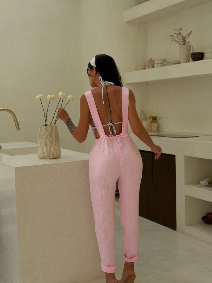 Kalhoty mají kapsy na bocích. Skrytý zip na zadečku v barvě mušelínu. Utahovací šňůrka, díky které si můžete kalhoty v pase vypasovat. Nastavitelná délka lacláčů.